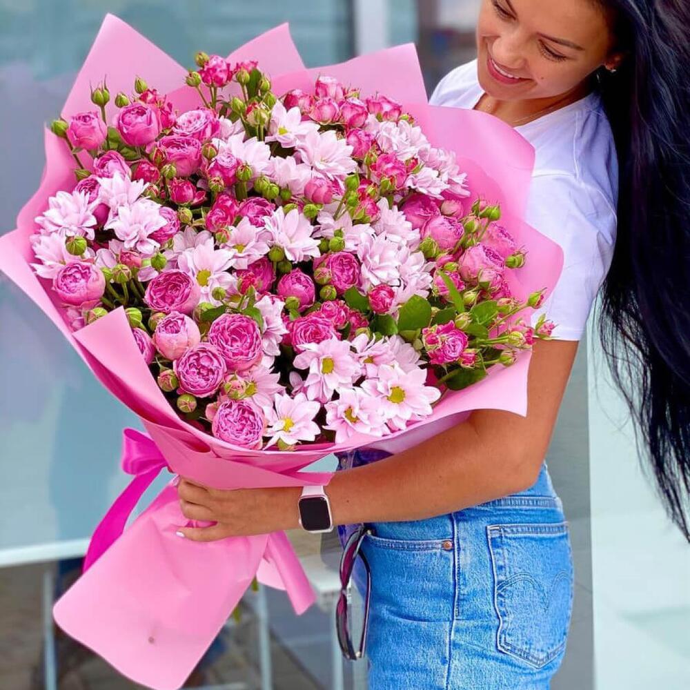 Пионовидные розы с кустовыми хризантемами в букете в Канаше