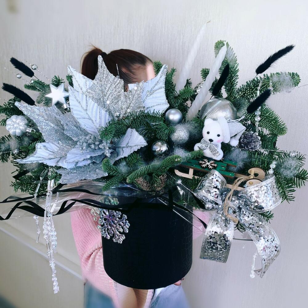 Композиция выполнена из натурального норвежского нобилиса. Это разновидность хвойных с ветками зелено-голубого оттенка. Его преимущество в том, что он не осыпается, как обычные ели и долго сохраняет свой внешний вид. Подарите вам и вашим близким новогоднюю атмосферу праздника ✨